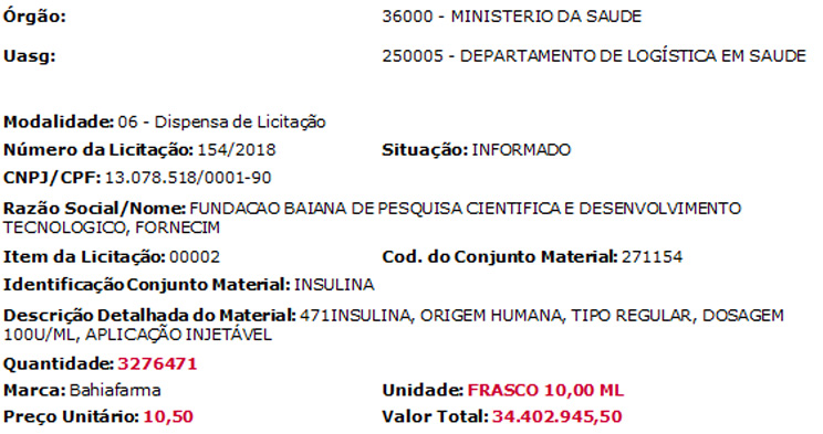 Posteriormente, o Edital para compra de Insulina Humana foi ratificado pelo órgão comprador, o Ministério da Saúde, que considerou o produto dispensado de licitação pública, uma vez que foi inserido no grupo de insumos estratégicos para o SUS, conforme este Aviso de Dispensa, cujo detalhamento segue aqui: